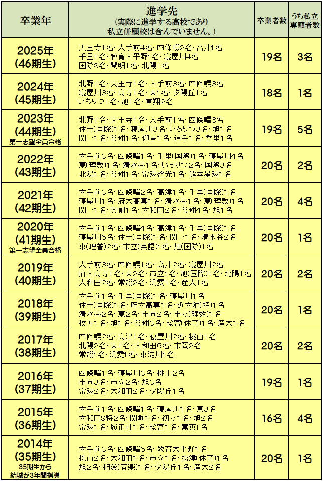 これまで,大手前高校へだけでも当塾から約200名が進学していきました。ここでは進学実績を示しますが,本当の実績とは,卒業生の皆さんが今後どのように飛躍してくれるか,幸せな人生を送ってくれるかであると考えています。今後も,社会の一翼を担う優秀な若き力を世に送ることにより,関目に,日本に貢献することを理念として,指導を続けてまいります。